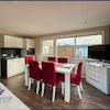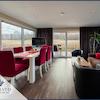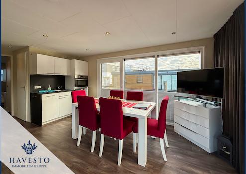 Das größere Hausboot mit ca. 95 m² Wohnfläche erstreckt sich über Erdgeschoss, Obergeschoss und eine großzügige Dachterrasse. Der offene Wohn-Essbereich mit Panoramablick auf den See bildet das Herzstück der Immobilie. Die voll ausgestattete Wohnküche bietet moderne Elektrogeräte, großzügigen Stauraum und einen direkten Blick aufs Wasser. Der angrenzende Wohnbereich überzeugt mit hochwertiger Möblierung, Kamin, Soundsystem und maßgefertigten Fensterbänken als zusätzliche Sitzgelegenheiten.