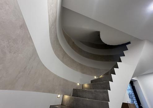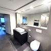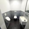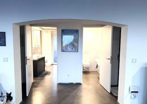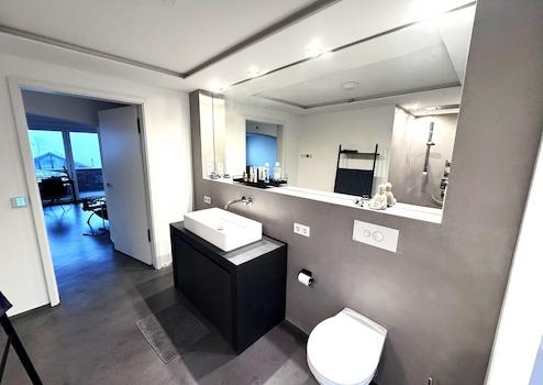 Das Schlafzimmer bietet Ruhe und Rückzugsmöglichkeiten. Das hochwertige Badezimmer ist mit einer bodenebenen Dusche ausgestattet und vollständig in edlem Sichtbeton ausgeführt – modern, puristisch und zeitlos. Zusätzlich steht ein separates Gäste-WC mit Toilette und Urinal zur Verfügung.