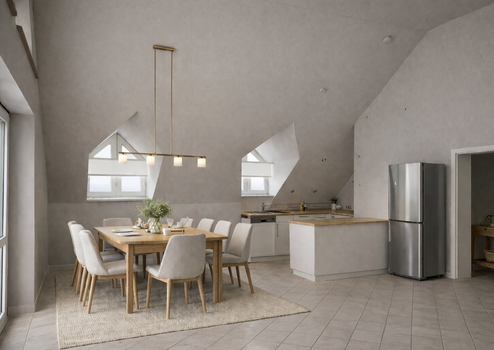 Die Küche ist mit einer in weiß gehaltenen Einbauküche inklusive Elektrogeräten ausgestattet. Die in den Fotos dargestellten sonstigen Einrichtungsgegenstände und Accessoires sind KI generiert.