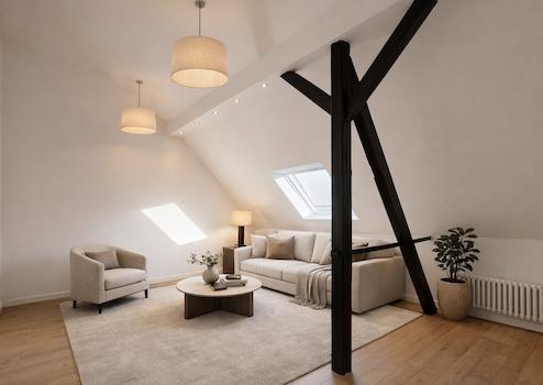 Ein besonderes Highlight ist das ausgebaute Dachgeschoss: sichtbare Balken, hohe Decken und ein großes Dachflächenfenster verleihen dem Raum einen loftartigen Charakter perfekt als Atelier, zusätzliches Schlafzimmer oder individueller Rückzugsort.