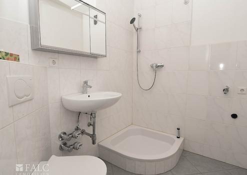 Zurück im Flur schließen sich rechts und links eine Einbauküche mit Kühlschrank an und auf der anderen Seite das erst vor ein paar Jahren renovierte Badezimmer mit einer Dusche. Hier ist auch Platz genug zum Aufstellen einer Waschmaschine. Im Flur bietet ein kleiner Einbauschrank über der Tür Stauraum an.