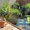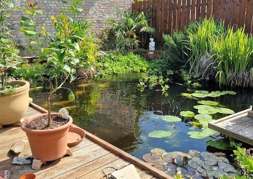 Technikraum, Scheune, Garten mit einen Koi-Teich.