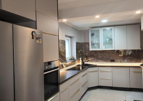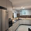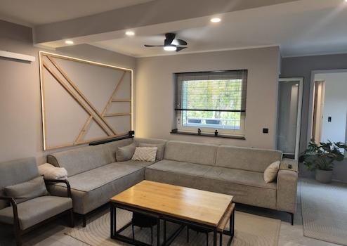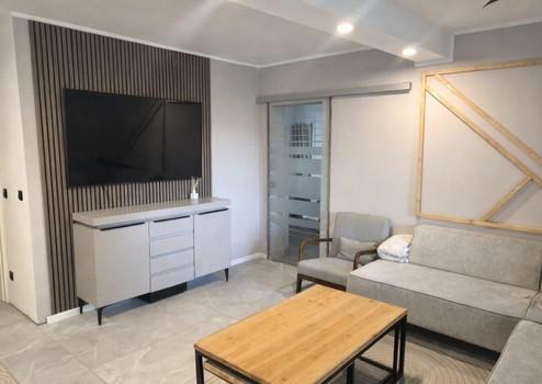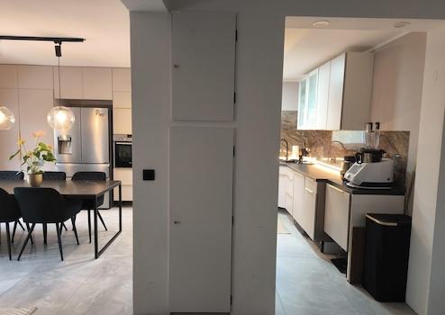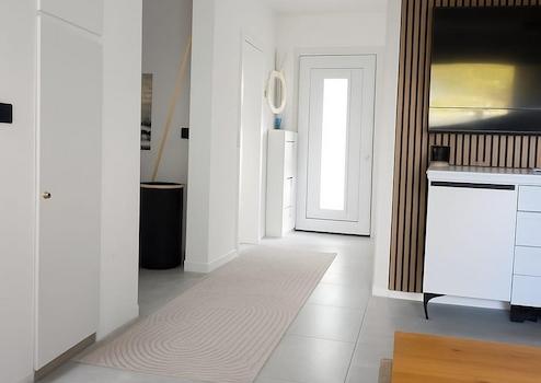 • Neuer Boden in 60×120 cm Fliesen (Wohnzimmer/Essbereich/Küche)