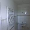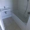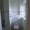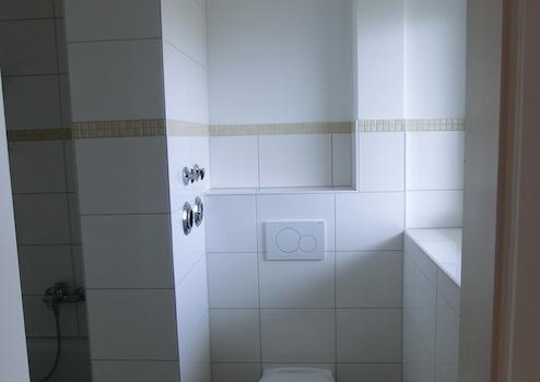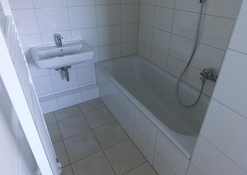 Das Badezimmer ist mit einer Badewanne ausgestattet. Zwischen der Toilette und der Badewanne befindet sich eine Trennwand.