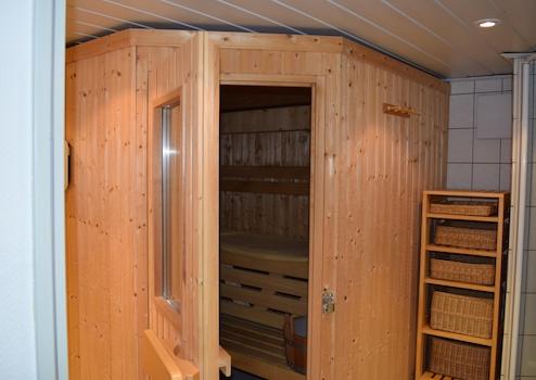 Der Wellnessbereich mit Sauna unterstreicht den gehobenen Wohnkomfort. Durch die Tageslichtfenster wirkt das Untergeschoss hell und wohnlich.