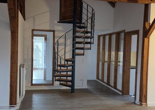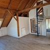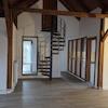 Der Wohnbereich besticht nicht nur durch seine Größe insgesamt, sondern auch durch seinen "Galeriecharakter", einer komplett offenen Balkendecke und einer Wendeltreppe in einen separaten Raum in das Dachgeschoss.