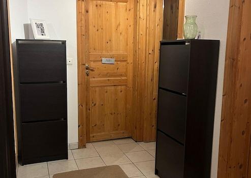 Über einen verglasten eigenen Treppenauf- und Eingang, betritt man die 3,5 Zimmer Wohnung in einem MFH mit insgesamt 4 Mietparteien.