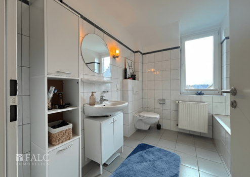 Sie betreten die Wohnung über den Flur, von dem alle Bereiche bequem erreichbar sind, ohne lange Wege. Direkt angrenzend liegt das Tageslicht-Badezimmer mit Wanne und Dusche. Es ist kompakt geschnitten und bietet Platz für die üblichen Sanitärobjekte sowie Stauraum für Handtücher und Pflegeartikel.