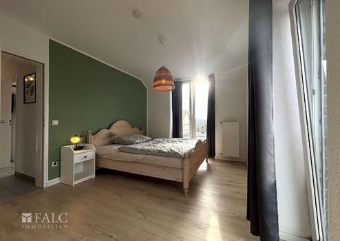 Im Elternschlafzimmer lässt sich durch die gute Raumgröße ein Bett und Kleiderschrank problemlos stellen, ohne dass der Raum überladen wirkt.