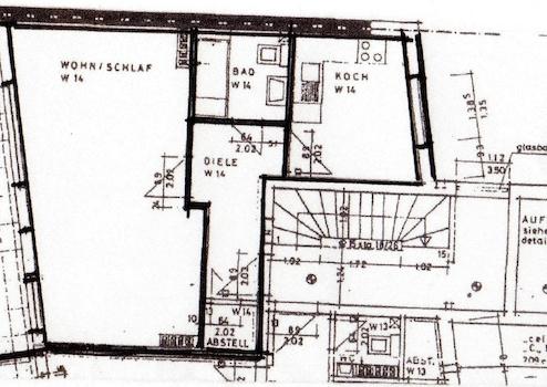 - Alle Wände (es gibt keine schrägen Wände) sind gegipst und weiß gestrichen (auch Küche).