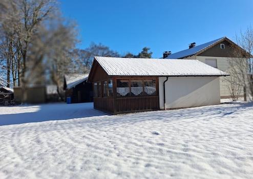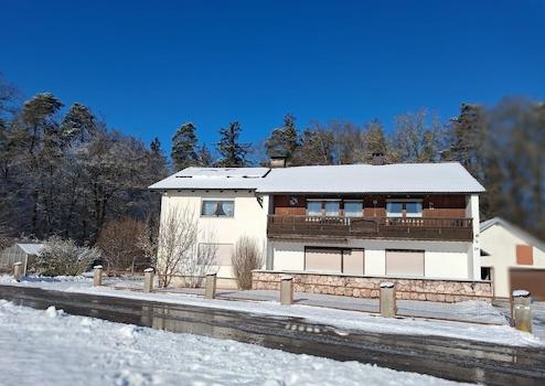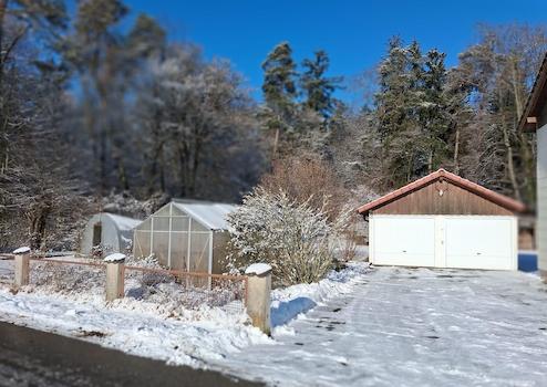 Ein an der neuen Doppelgarage angrenzender Freisitz (überdacht und eingeglast) lädt zu schönen Stunden bei jeder Witterung ein. Hier in absolut uneinsehbarer Ruhe mit Blick auf Wald und Wiese, kommen auch gerne mal Rehe aus dem anliegenden Wald vorbei.