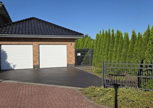 Grundstück ist komplett eingezäunt und abschließbar (vorne verzinkter pulverbeschichteter Schmiedeeisenzaun, seitlich und hinten 182cm hoher Doppelstabmattenzaun)