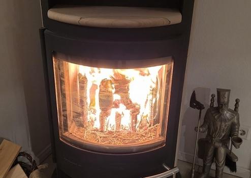 lichtdurchfluteter Wohn- und Essbereich mit Kaminofen und offener Küche (Einbauküche Nobilia),