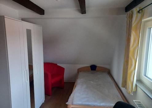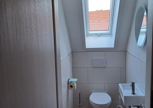 Die Wohnung verläuft über das 1. OG und das DG. Im ersten OG. Befindet sich die voll ausgestattete Küche, zwei Zimmer, eine Tageslicht Walk-In-Dusche mit Regenbrause und ein Gäste-WC ebenso mit Tageslicht. Im Bad ist ausreichen Platz zur Unterbringung einer Waschmaschine und eines Trockners. Entsprechende Anschlüsse sind verlegt. In jedem Zimmer befindet sich ein LAN-Anschluss.