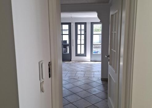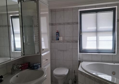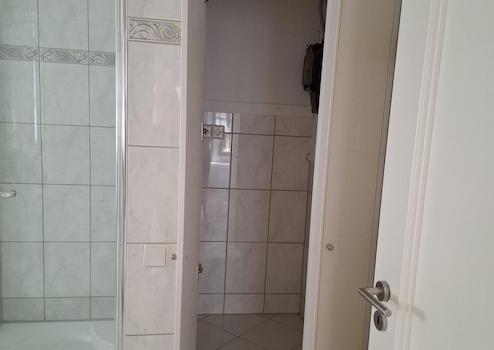 Helle, ca 75m² Einliegerwohnung: großes Tageslichtbad mit Eckbadewanne mit Whirlpool, Bidet, Einbauküche, Schlafzimmer m. Einbau-Kleiderschrank, Küche neu eingebaut, mit Terrasse