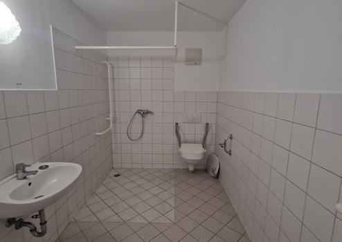 - gefliestes Badezimmer mit ebenerdiger Dusche