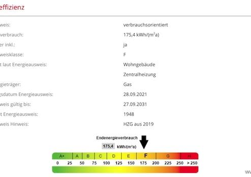 Ein Energieausweis für das Bestandsgebäude liegt vor (verbrauchsorientiert, Endenergieverbrauch 175,4 kWh/(m²·a), Effizienzklasse F, Gas, Baujahr 1948, Heizung aus 2019).