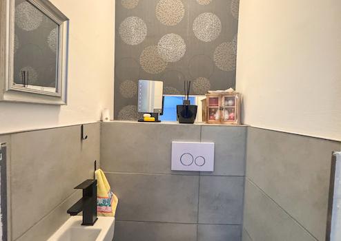 Mit insgesamt drei Schlafzimmern eignet sich die Wohnung ideal für Familien oder Paare mit Platzbedarf. Das modern gestaltete Badezimmer ist mit einer ebenerdigen Dusche ausgestattet, zudem steht ein separates, ebenfalls modernes WC zur Verfügung.