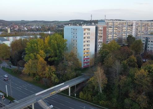 Die Wohnung befindet sich in einem zehngeschossigen Mehrfamilienhaus mit Aufzug in verkehrsgünstiger Lage am Rand von Gera-Lusan.