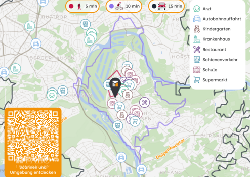 Die Versorgungswege sind ausgesprochen komfortabel: Das Zentrum von Überruhr Hinsel ist in wenigen Minuten erreichbar, und die Anbindung an die Essener Innenstadt ist sowohl mit dem Auto als auch mit öffentlichen Verkehrsmitteln optimal.