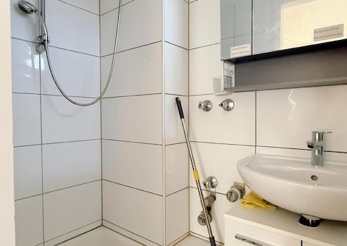 Die Wände des Apartments sind mit Raufaser tapeziert und weiß gestrichen. In den Wohnräumen und in der Diele wurde ein Laminatboden verlegt. Das innenliegende Duschbad ist im modernen Stil, mit großformatigen beigen Bodenfliesen sowie einem weißen Fliesenspiegel ausgestattet.