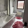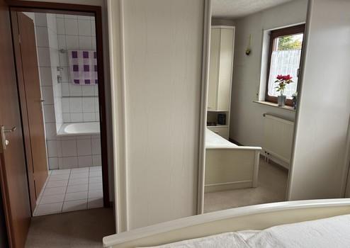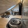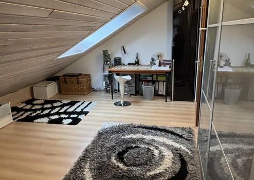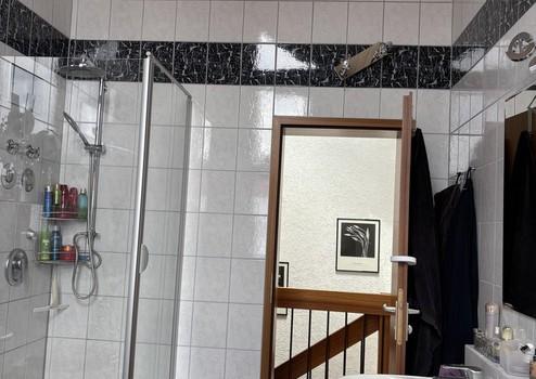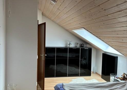 Unter dem Dach befindet sich das Schlafzimmer, ein Arbeits-Kinderzimmer sowie ein Bad mit 2 Waschbecken, Bidet, Badewanne, Duschkabine und WC (Fensterhöhe 4,5 Meter).