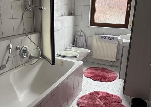 Das Badezimmer mit Tageslichtfenster ist modern und mit WC, Bidet, Waschbecken und Badewanne ausgestattet.
