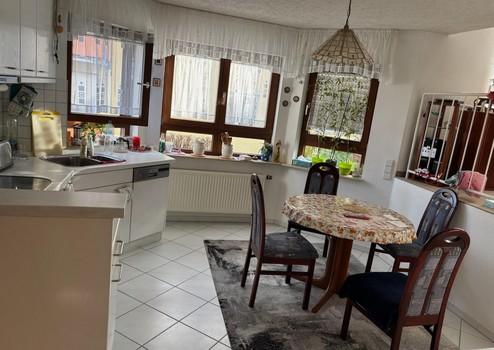 Der Küchen- und Essbereich ist in einem Erker mit 3 Fenstern integriert die mit elektrischen Rollläden ausgestattet sind. Die Küche ist eine Maßanfertigung und wurde individuell für den Raum geplant.