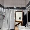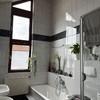 Das obere Badezimmer hat eine Deckenhöhe von ca. 4,50 cm, Deckenhohe Fenster runden das Bad ab.