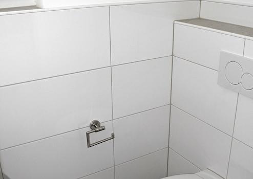 Hochwertige Fliesen in Bädern, Gäste-WC, professionelle Sanitärobjekte, barrierefreie Nutzung.