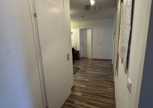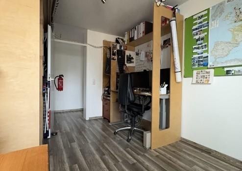 Großzügiger Flur, Schlafzimmer (Südseite mit Außenjalousie), helles Wohnzimmer (Westseite mit Außenjalousie, Plissees, Zugang zum Balkon), Büro/Kinderzimmer (Westseite mit Außenjalousie), Küche (Einbauküche mit Siemens-Geräten, Backofen Whirlpool – im Preis inkl.).
