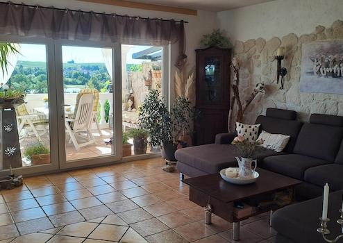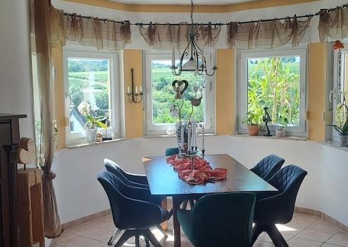 Das Herzstück des Hauses bildet das Wohnzimmer mit direktem Zugang zur überdachten Terrasse. Von hier eröffnet sich der unverbaute Blick über die Weinberge der „Toskana Rheinhessens“ – ein Anblick, der jeden Tag aufs Neue beeindruckt.