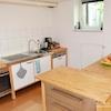 Neu renoviertes Apartment im Erdgeschoss eines Einfamilienhauses in Hannover-Ricklingen. Wohnküche mit Tisch mit Stuhl, Küchenzeile, komplett ausgestattet mit Kühlschrank, Mikrowelle, 2-Plattenkochfeld, Zugang zur ...