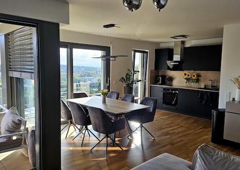 Die große Panorama Fensterfront bietet einen spektakulären 180 Grad Weitblick über das Rheintal bis hin zu den Vogesen, ob vom Wohnzimmer, vom Balkon oder vom Bett aus. Genießen Sie das großzügige Raumgefühl in einem hochwertigen Neubau mit moderner Ausstattung und Aufzug.