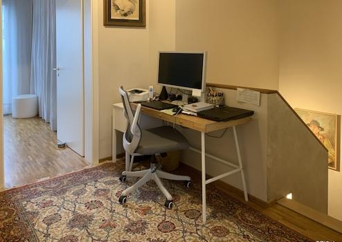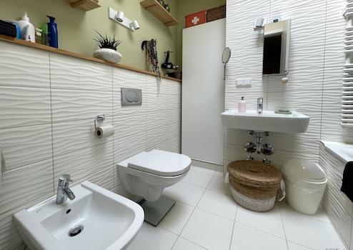 Das Badezimmer präsentiert sich komfortabel ausgestattet mit Badewanne, WC, Waschbecken und Bidet. Eine Fußbodenheizung sowie ein zusätzlicher Handtuchheizkörper sorgen für angenehme Wärme. Ein Oberlicht schafft natürliche Belichtung, während eine moderne Lüftungsanlage kontinuierlich Frischluft zuführt. Ergänzend steht auf der unteren Ebene ein separates Gäste-WC zur Verfügung.