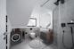 Garderobenbereich sowie ein modernes helles Badezimmer mit Tageslicht.