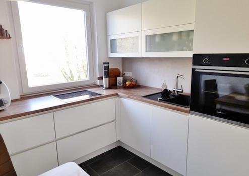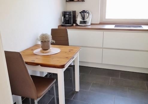 Zur vorderen Hausseite befindet sich eine modern eingerichtete Küche mit elektrischen Geräten, wie Ceranfeld, Backofen sowie einer Kühl- und Gefrierkombination. Die helle Einbauküche wurde vor fünf Jahren neu eingebaut und sie besticht durch moderne Front und eine geschmackvolle Arbeitsplatte. Die anthrazitfarbenen Bodenfliesen verleihen dem Raum einen modischen Charakter. Einen kleinen Essplatz können Sie hier ebenfalls unterbringen.