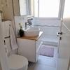 Direkt neben der Küche liegt das geschmackvolle Tageslicht-Duschbad, welches mit hellen sandfarbenen Fliesen – die perfekt mit dem Waschtischmobiliar harmonieren – ausgestattet ist.