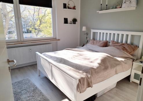 Zur rechten Seite der Wohnung liegt das lichtdurchflutete und geräumige Wohn- und Esszimmer sowie das Schlafzimmer. Das Wohnzimmer bietet Ihnen genügend Raum, um Ihre Sitzecke sowie einen Esstisch unterzubringen. Zudem haben Sie hier Zugang zum Süd-West-Balkon.