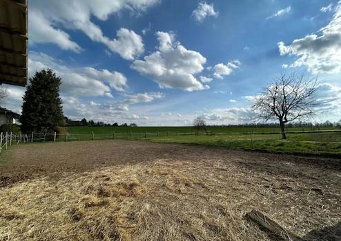 Im hinteren Bereich ist ein Garten mit Obstbäumen angelegt, mit einem unverbautem Blick in die Natur. Für Pferdeliebhaber ist es ein Paradies, mit einer Reithalle und Koppeln direkt am Wohnhaus.