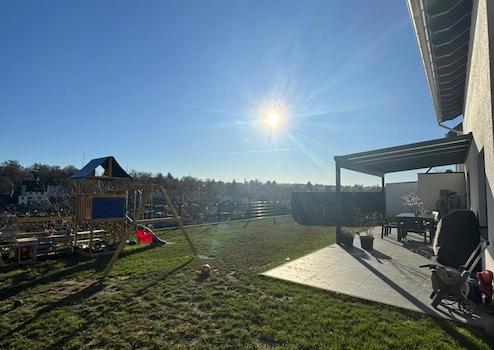 Der helle, offene Wohn- und Essbereich schafft Raum für gemeinsame Mahlzeiten und gemütliche Abende. Große Fensterflächen eröffnen den Blick in den sonnigen Südgarten, der Kindern viel Platz zum Spielen bietet und zur Entspannung auf der ca. 35 m² großen, überdachten Terrasse einlädt.