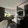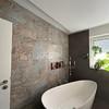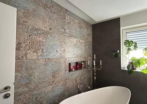 - Exklusives Hauptbadezimmer mit freistehender Badewanne, bodengleich geflieste Walk-In Dusche mit Unterputz-Regendusche und großem Keuco Waschbecken