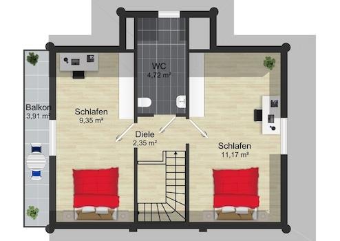 Das Dachgeschoss beinhaltet drei Schlafzimmer und ein Wannenbad mit Tageslicht. Jedes Zimmer hat Zugang zu dem überdachten Giebel-Balkon. Der Dachboden bietet zusätzlichen Stauraum.
