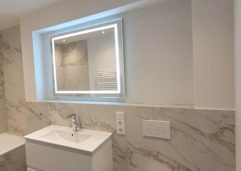 Das Badezimmer ist mit modernen Boden- und Wandfliesen ausgestattet. Das Badezimmer verfügt über eine Rain Shower. Zusätzlich zum großen Kellerabteil befindet sich im Keller ein Waschraum mit eigenem Stellplatz für Ihre Waschmaschine und Trockner. Ein gemeinschaftlicher Fahrradraum ist vorhanden. Ein Gemeinschaftsgarten ist vorhanden. Die Wohnungen verfügen über eine gehobene Ausstattung Fußbodenheizung, CAT Verkabelung, eine Küche mit Backofen Geschirrspüler und Kühlschrank ( im Mietpreis enthalten (!), eine Video Gegensprechanlagen, Rolläden , Waschbeckenunterschränke in allen Bädern, Kosmetikspiegel ( ebenfalls im Mietpreis bereits enthalten) etc.