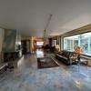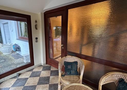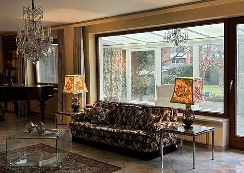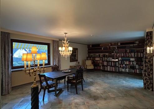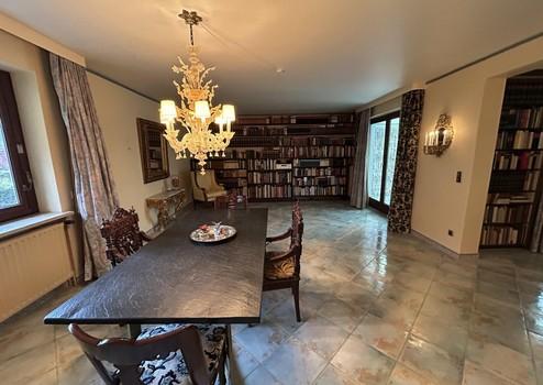 Wohnzimmer mit einem offenen Travertin-Kamin für entspannte Familienmomente, einer großen Bibliothek, sowie einem offenen Esszimmer, mit direkter Verbindung zur Küche. Ebenso geht es von dort zum Wintergarten von ca 25m² mit einem harmonischer Übergang auf die Terrasse und in den Garten. Das Erdgeschoss hat des weiteren auch ein separates Gästezimmer. Angrenzend befindet sich eine