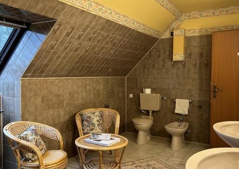 Das Obergeschoss von ca 141m² bietet 3 helle Schlafzimmer, darunter eines mit begehbarem Kleiderschrank und ein weiteres kleineres Zimmer, das man ideal als Büro oder Atelier nutzen könnte, sowie ein Vollbad mit zwei Waschtischen und einem Bidet im klassischen Stil der 70-er Jahre. Damit stehen vielfältige Nutzungsmöglichkeiten für unterschiedliche Familienbedürfnisse zur Verfügung.