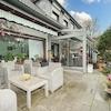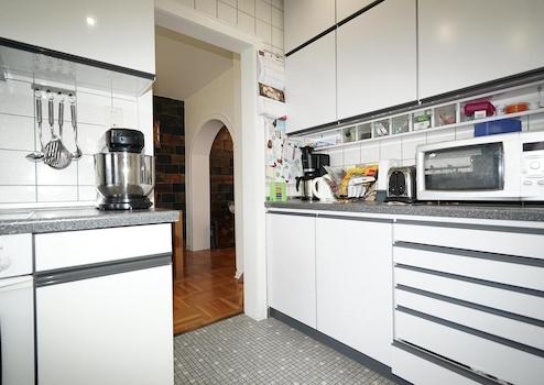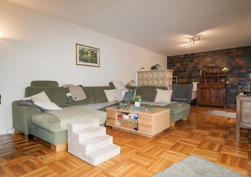 Das sehr große, helle Wohnzimmer hat einen wunderbaren Blick in den parkähnlichen Garten, der sich zur Zeit im Winterschlaf befindet. Ein neuer Wintergarten und eine zusätzliche schöne Terrasse sollten ebenfalls erwähnt werden. Im Wohnzimmer befindet sich das Herzstück des Hauses, der Kachelofen, der für besondere Behaglichkeit sorgt. Zur Zeit reicht die Wärme des Ofens für die komplette Wärme im Untergeschoss aus.