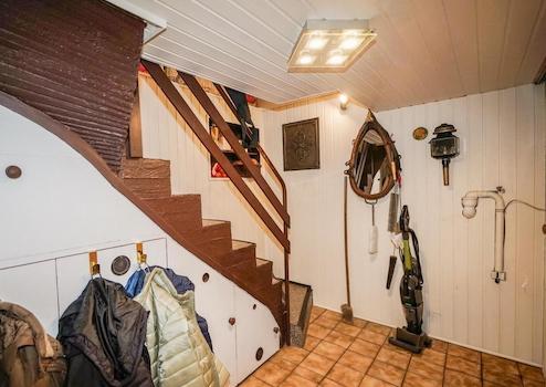 Im Erdgeschoss erreicht man von der Diele ein Gäste WC, die Küche, das Wohnzimmer, den Kellerabgang und die Treppe zum Obergeschoss.
