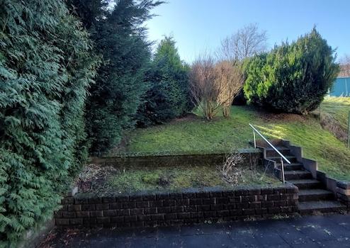 Es verfügt über eine Doppelgarage, einer großen Terrasse, einen kleinen Balkon und einem grünen Garten mit leichter Hanglage.