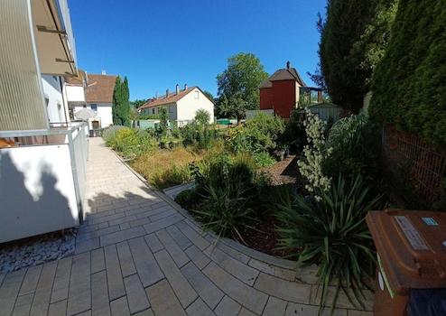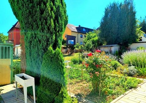 Eigener Kellerraum, großer Bühnen-/Dachbodenbereich sowie kleine, der Wohnung zugeordnete Gartenparzelle (rechte Seite mit Sitzbank) bieten viel zusätzlichen Stauraum und Aufenthaltsqualität im Freien.